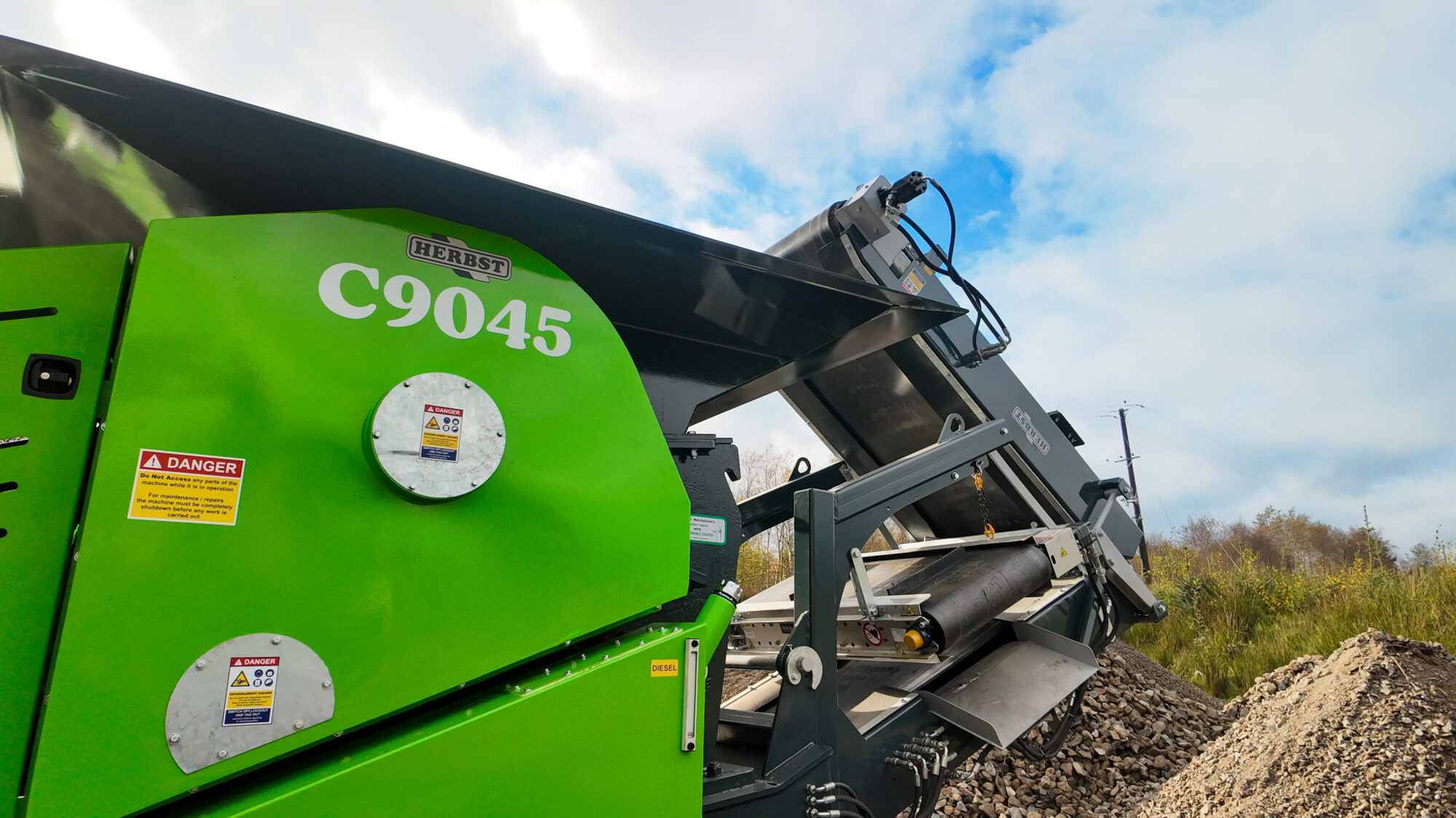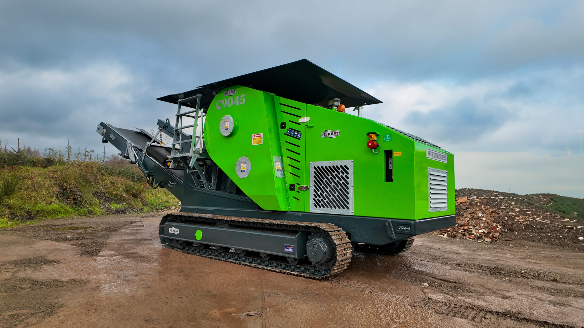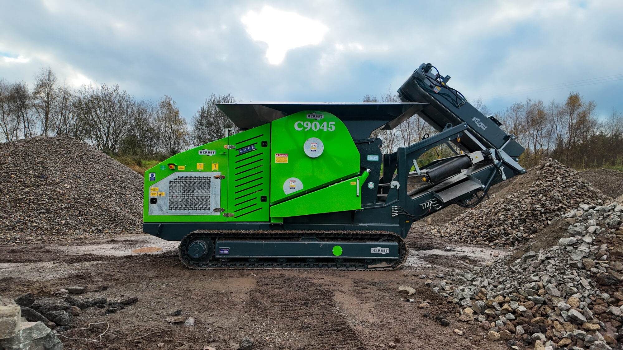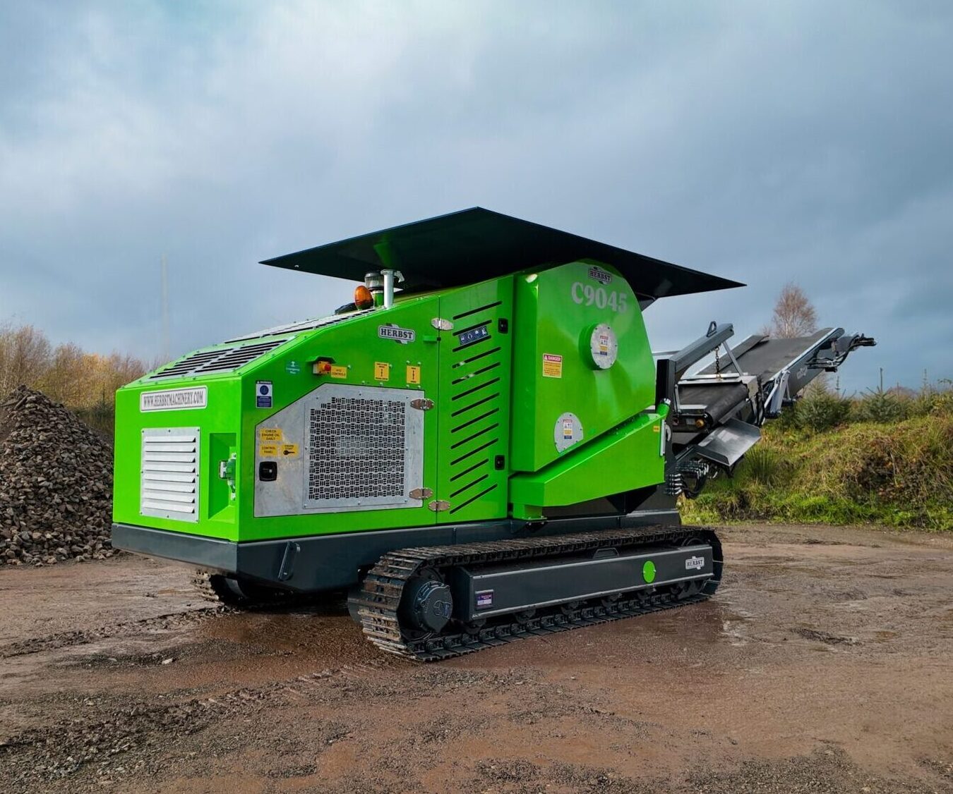 At the heart of the C9045 is a 900 × 450 jaw, fed via a direct-feed hopper and protected by Hardox lining to withstand abrasive materials and extend service life. Material is crushed efficiently and discharged onto a folding conveyor, with an integrated overband magnet for effective ferrous metal separation.
