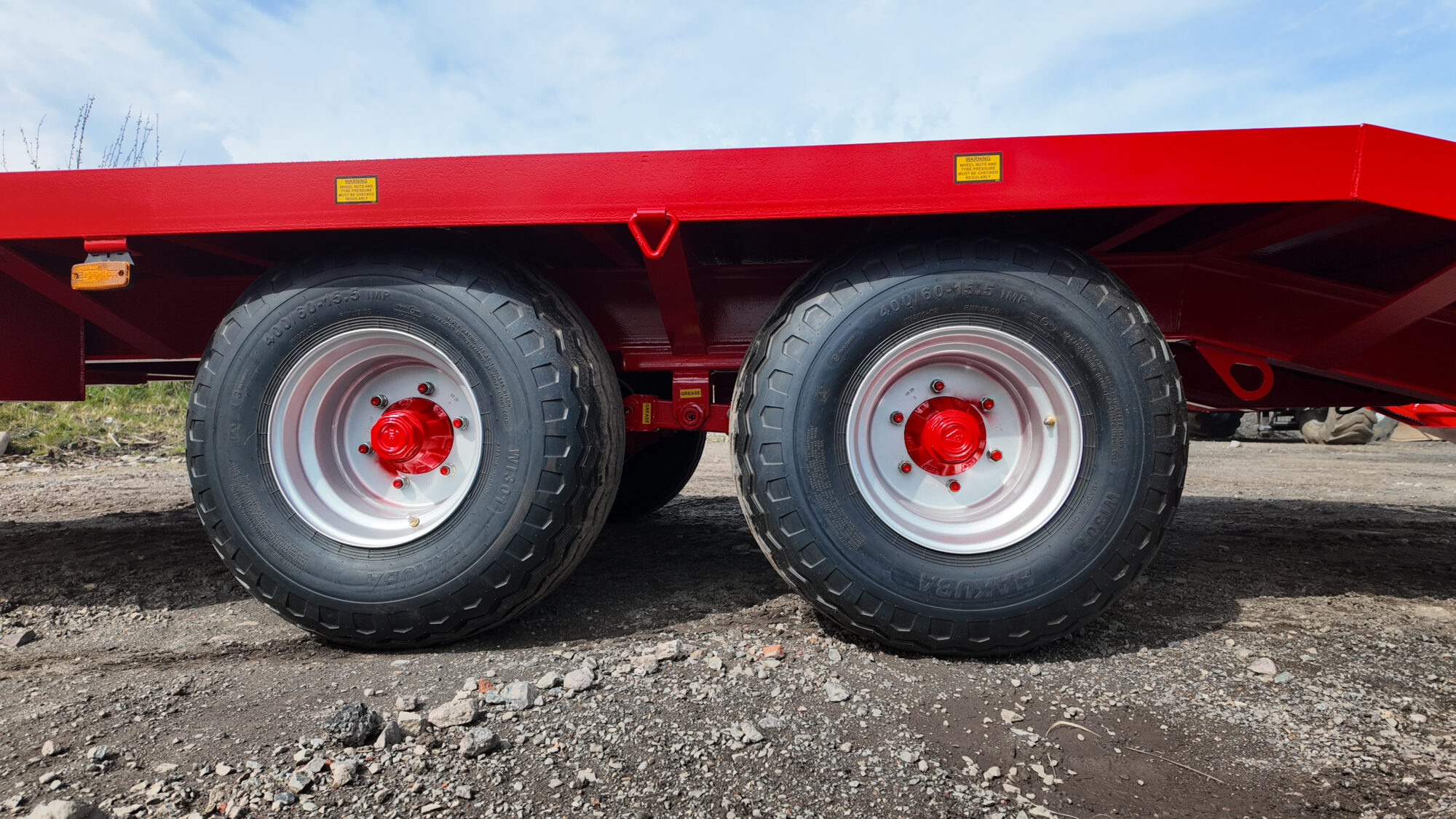 Running on 6-stud axles, with 5-leaf spring suspension and 400/60 R15.5 flotation wheels, providing a compact yet heavy-duty solution for lighter transport requirements.